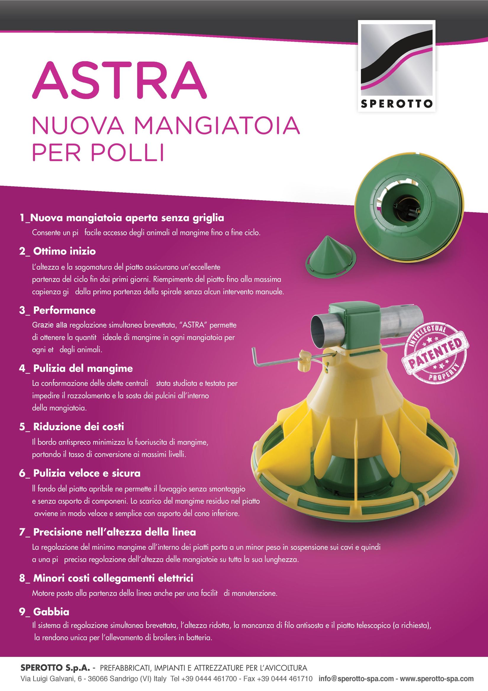 New entry nella famiglia di attrezzature per l'allevamento di broilers, "ASTRA" coniuga l'esclusivo sistema ad "alette" anti-intrusione all'ormai celebre regolazione centralizzata e simultanea del mangime "SPEROTTO".