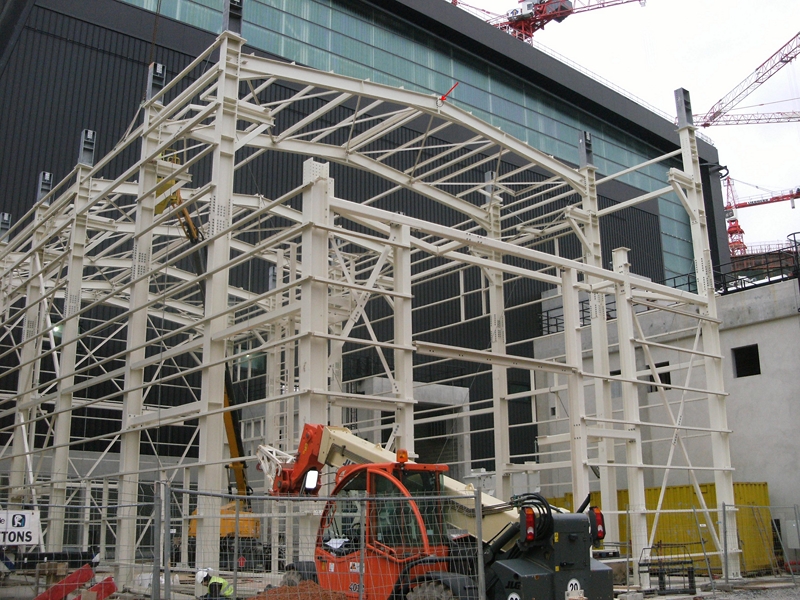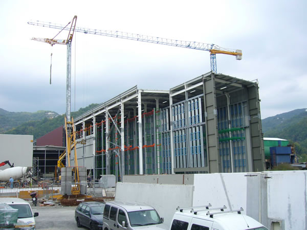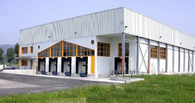 Si possono notare le tante strutture in acciaio prefabbricate in fase di costruzione e capannoni industriali finiti.