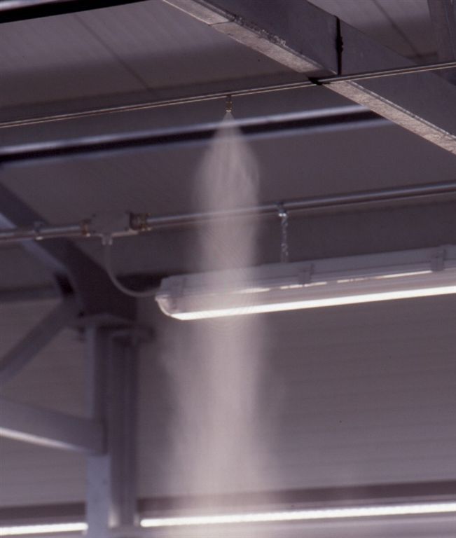 Этот тип системы охлаждения зделан из распылительных сопел, установленных на продольных линий внутри фермы. Цель состоит в том, чтобы распылить воду, которая, благодаря также системы вентиляции, приводит к освежении животных. Вода находится под давлением с помощью насоса. Работа системы происходит в полном автоматическом режиме посредством блока управления климат-контроля здании.